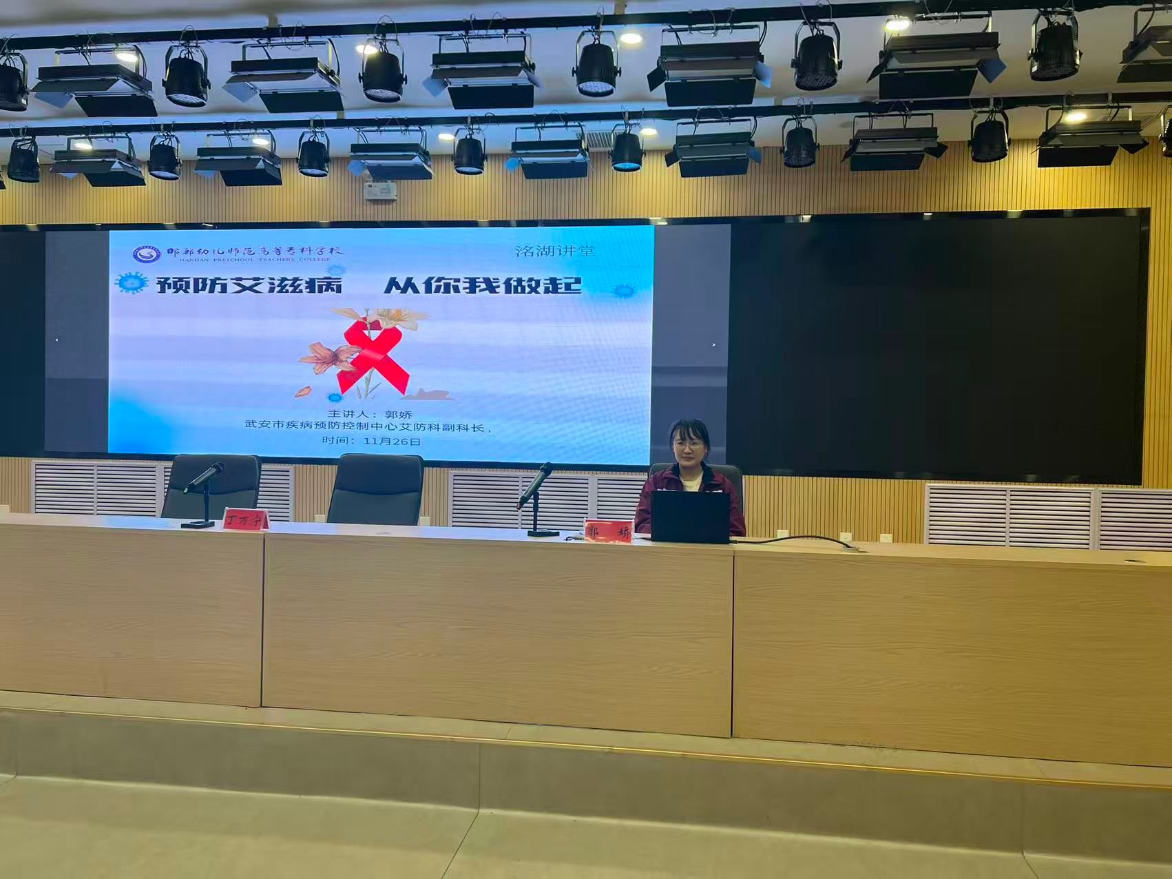 11月26日,我校在图书馆报告厅举办第五期洺湖讲坛,邀请武安市疾控中心艾防科副科长郭娇开展《预防艾滋病,从你我做起》专题讲座。讲座以普及防艾知识、消除歧视偏见、倡导科学防护为核心,让防艾知识深入人心,营造知艾防艾的校园环境。继续教育与培训中心全体人员和师生代表200余人参会。
